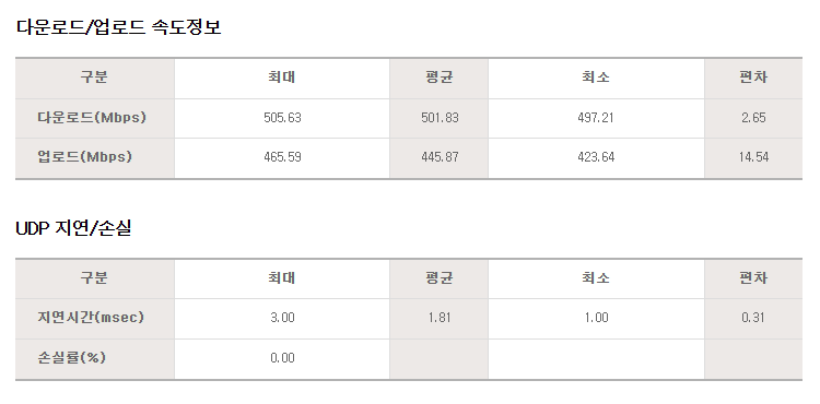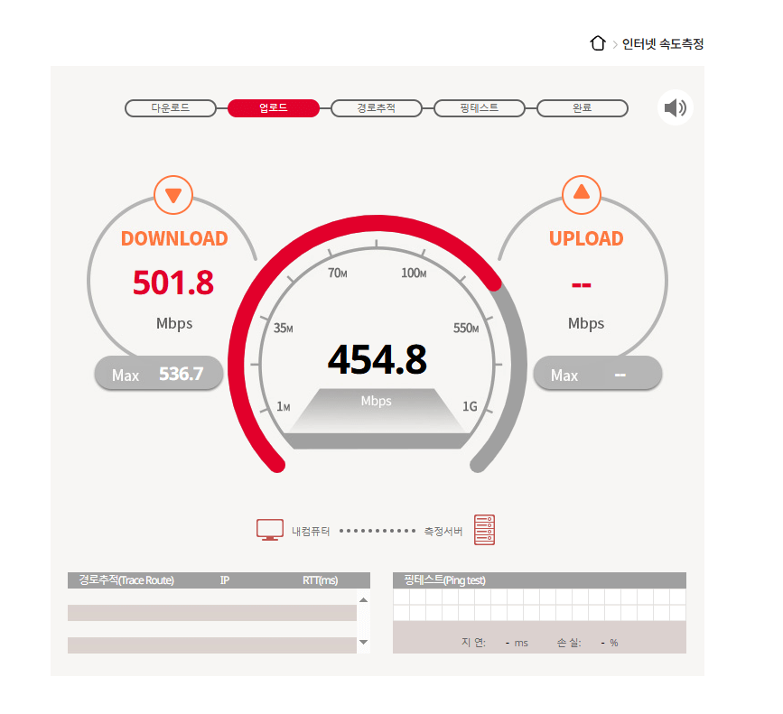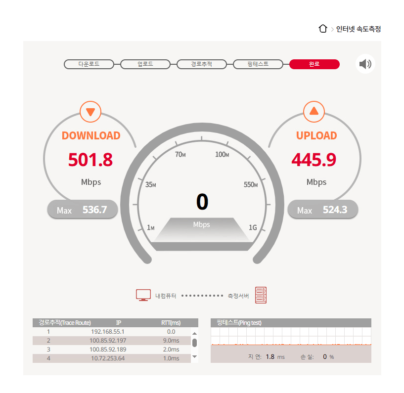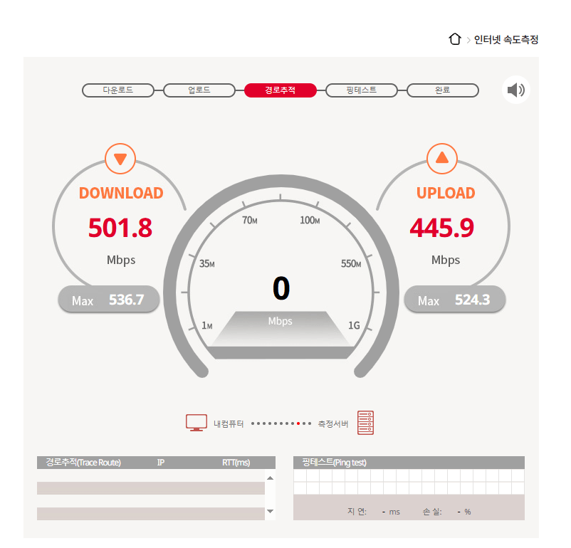 프로그램 설치 후 새로고침 하게 되면 다운로드 -> 업로드 -> 경로 추적 -> 핑 테스트 측정하고 완료하게 됩니다. 현재 저의 인터넷 속도 측정 이력은 평균 다운로드: 501.83, 편차는 2.65 / 업로드: 445.87, 편차는 14.54로 나왔습니다.