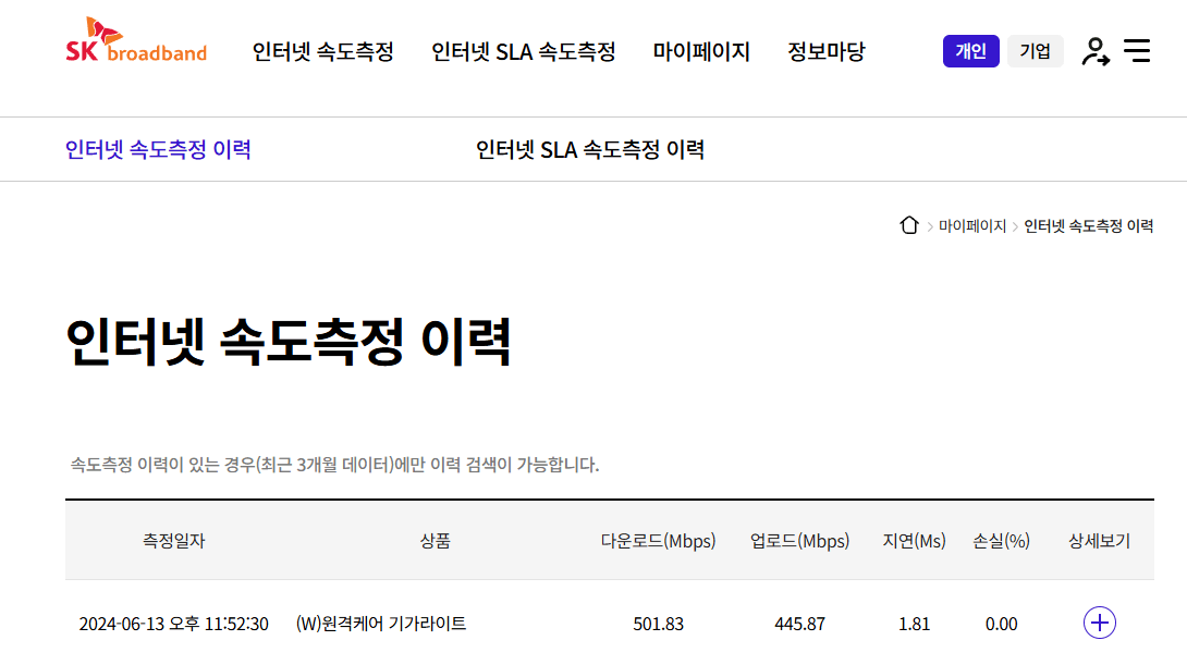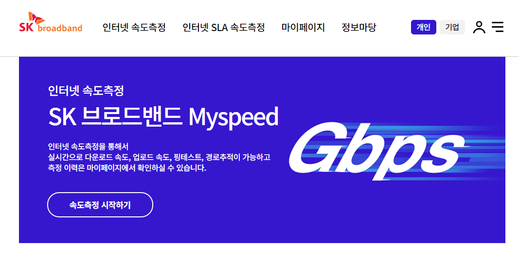 sk broadband 홈페이지(http://myspeed.skbroadband.com/main.asp) 접속하여 인터넷 속도를 측정할 수 있습니다. 실시간으로 다운로드 속도, 업로드 속도, 핑 테스트, 경로 추적이 가능하고 마이페이지에서 관련 내용 상세보기가 가능합니다. 속도 측정 시작하기 버튼을 누릅니다.