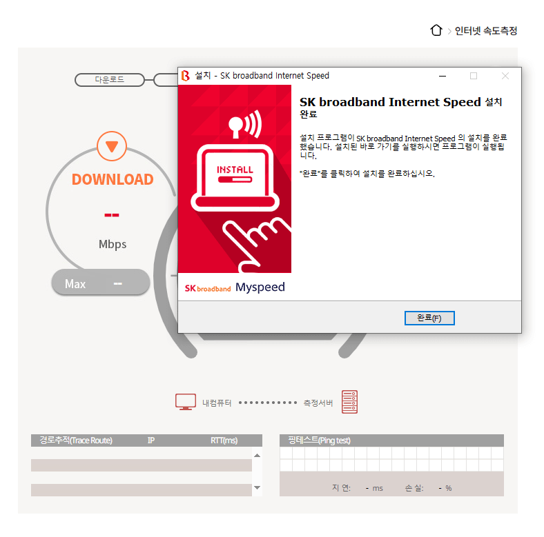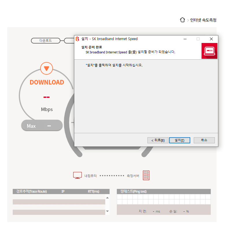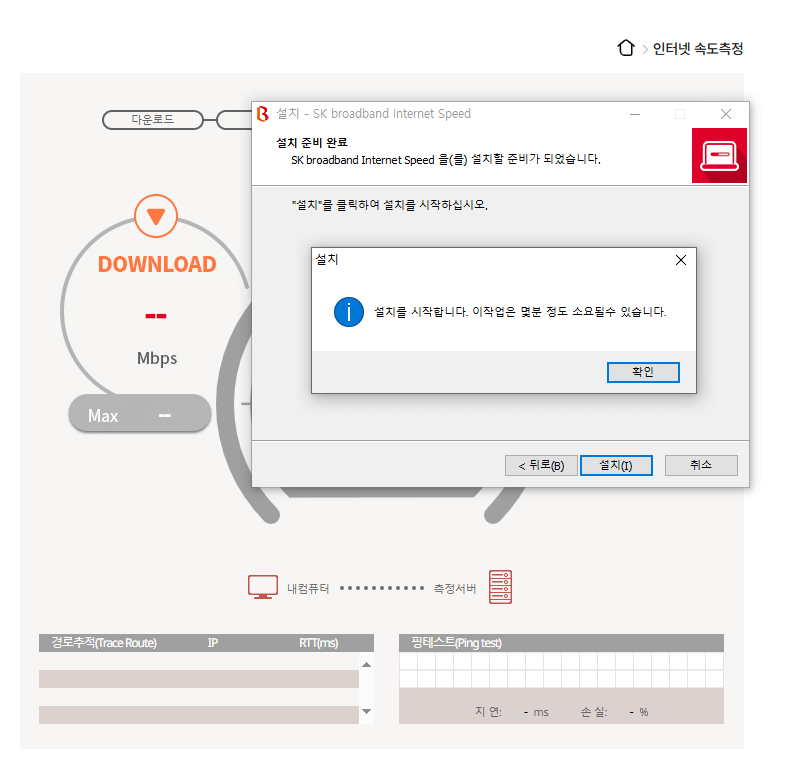 초고속인터넷(기가) 속도 측정용 프로그램인 SKBInternetSpeed 설치 파일을 다운받아 설치합니다. 이 프로그램이 설치되어 있어야 속도 측정이 가능합니다. 1~2분 안에 빠르게 설치됩니다.